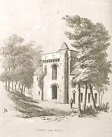 The main concentration of tower houses is in southern Pembrokeshire, Wales. These were first published with detailed drawings in 1877–8 by Rev. E L Barnwell.[2] The Pembrokeshire examples have a coastal distribution; this is also true of the Monmouth and Glamorgan tower houses, as well as the demolished examples at Penhryn (in Caernarfonshire) and Ty Gwyn (in Abermo).[3] Otherwise, the tower houses are distributed along the Welsh—English border, with one example, Wattlesborourgh, just over the border in Shropshire. In 1976, Hilling produced a map (with listing) showing seventeen examples.[4] Further houses have been added by Suggett and it is possible that new examples will be recognised as being incorporated into existing buildings, as at Sandyhaven House in Pembrokeshire.[5]