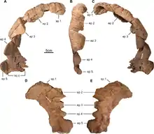 The maxilla, the upper jaw bone, of Wendiceratops had at least twenty-six tooth positions, in each of which several teeth were stacked to form a tooth battery. No orbital horns have been found. The nasal bone bore a vertical nasal horn. The exact size and profile of this horn are unknown but one broken specimen has a height of 11.5 centimetres (4.5 in) and a base length of 9 centimetres (3.5 in). Contact facets with the prefrontal bone suggest that the horn was located just in front of the eye sockets.[1]