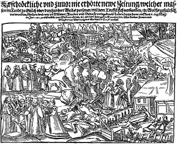 A 1591 broadside, Werewolves of Jurich, printed by Georg Kress, tells the story of the terrorising of the town of Jurich by hundreds of werewolves and depicts a number of male and female werewolves being executed, including some apparently wearing nun's veils.[4]