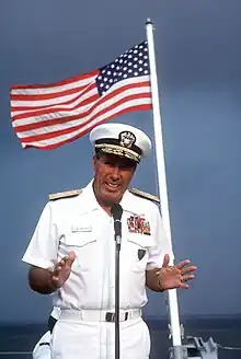 McDonald's career led him to the highest levels of the United States Navy's command structure. He attended the National Defense University's National War College, graduating with the class of 1969.[9] From 1970 to 1971, he commanded the USS Coral Sea.[10] In 1972, as a rear admiral, McDonald was assigned as the carrier group commander.[11] He later served as deputy chief of Naval Personnel in Washington, D.C., in 1975.[4] In the fall of 1977, as COM2ndFLT, The U.S.S. Harry E. Yarnell (CG-17) served as his flagship during NATO exercises in the North Atlantic. In 1978, as Commander of the U.S. Second Fleet, he embarked on the USS Arthur W. Radford on the way to NATO exercises in the North Atlantic.[12] In 1982, McDonald was appointed Supreme Allied Commander Atlantic (SACLANT), one of two supreme commanders of the North Atlantic Treaty Organization.[13] At the same time, he assumed command of the U.S. Atlantic Command (CINCLANT) and U.S. Atlantic Fleet (CINCLANTFLT). In 1983, McDonald, in his role as CINCLANT, was placed in overall command of Operation Urgent Fury—the invasion of Grenada to rescue U.S. nationals.[14][15] He later summed up the success of the operation in an address before the House Armed Services Committee.