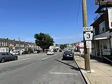 Past the I-476 interchange, PA 3 intersects Lawrence Road and crosses the Darby Creek into Haverford Township, where another section of Lawrence Road splits to the north. The road continues east past homes and businesses as it passes through the community of Havertown, reaching a junction with Eagle Road. PA 3 has an intersection with Manoa Road as it passes to the north of the Llanerch Country Club, continuing through suburban development. Farther east, the route crosses Naylors Run and heads into the community of Llanerch, where it intersects Darby Road a short distance before coming to a junction with US 1. After crossing US 1, PA 3 enters Upper Darby Township and continues past suburban businesses and homes. The road crosses State Road and heads into more urban areas of residential and commercial development. A set of SEPTA trolley tracks begins running in the median before the route comes to Terminal Square, where it crosses SEPTA's Route 101 and 102 trolley lines at-grade and intersects Victory Avenue/Garrett Road. Past this, PA 3 heads east on four-lane undivided Market Street as it passes between SEPTA's 69th Street Transportation Center to the north and urban businesses to the south, gaining a median before the 69th Street intersection. The route becomes undivided again and runs past more commercial development, forming the border between the borough of Millbourne to the north and Upper Darby Township to the south. PA 3 heads past some homes before turning into a divided highway at the eastern edge of Millbourne as SEPTA's Market–Frankford Line rises to pass over the road.[3][5]