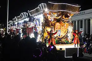 Effigies or "guys" representing the gunpowder plot instigators were added to the fire by local groups of people known as gangs. It would seem it was these gangs who started the trend towards a procession, as they paraded their guys towards the bonfire. As years passed by, the tradition was continued and the annual celebration became more and more elaborate, involving costumes, and music, until the key feature of the event was a large carnival procession.[1]