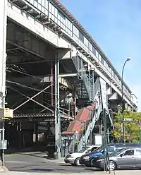 This elevated station, situated on a high curve, one of the highest elevations on the line, has three tracks and two side platforms. The center track is used by the 5 train during rush hours in peak direction. The northbound platform is longer than the southbound one and can fit about 12 cars.[3][16]