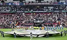 The draw for the third qualifying round was made on 15 July 2016, with West Ham being drawn against Domžale of Slovenia, after they defeated Shakhtyor Soligorsk from Belarus in the second qualifying round.[94] West Ham were originally drawn to play the first leg at their new home, the London Stadium, but due to a clash with the Anniversary Games, the club received permission from UEFA to reverse the order of the legs.[95] The away leg was switched from Domžale's Sports Park ground, to the 16,038 capacity Stožice Stadium in Ljubljana, home of the Slovenia national team.[96] West Ham lost the first leg away in Slovenia on 28 July, with Matic Črnic scoring a penalty in the 11th minute after a handball by debutant Håvard Nordtveit, only for Mark Noble to equalize from the penalty-spot seven minutes later, after Winston Reid was fouled by Domžale's goalkeeper Axel Maraval. Črnic scored a second goal three minutes into the second half to give the Slovenians a 2–1 victory.[97] Seven days later, West Ham hosted Domžale in the club's first ever game in their new home, the London Stadium. West Ham won 3–0 with two goals from Cheikhou Kouyaté and a third from Sofiane Feghouli, resulting in a 4–2 aggregate victory to progress to the play-off round.[98]