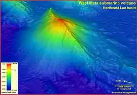 The volcano has known to be both hydrothermally and eruptively active in recent history, the most active in between its neighboring volcanoes.[15] According to depth differences in West Mata's flanks, it was pointed out that West Mata had an eruption which lasted from 1996 to 2008 at a depth of 2,750 m (9,022 ft).[16]