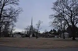 The West Parish Center District encompasses the social and religious center of the part of Andover, Massachusetts, that is located west of the Shawsheen River. It is mostly spread along Lowell Street (Massachusetts Route 133) on either side of a major intersection with four other roads: Shawsheen Road, Reservation Road, Beacon Street, and High Plain Road. The centerpiece of the district is the 1826 West Parish Church, which is the oldest church standing in Andover. It is an elegant Federal style granite structure topped with a wooden steeple, added in 1863. The roof is made of Spanish tile, which was probably part of changes made around 1908. Opposite the church on the south side of the common is the West Parish Cemetery, which began as a small burying ground in the 1790s, and was substantially enlarged and restyled (including the addition of the large arch at its main entrance) in the early 1900s.[2]