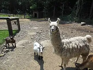 Three goats and one llama standing around in the zoo - Bengal tigers (Orange and White)
