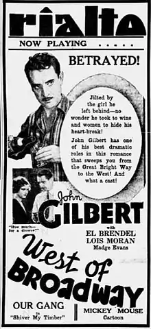 West of Broadway is a 1931 American pre-Code drama film directed by Harry Beaumont and written by Ralph Graves, Bess Meredyth, Gene Markey, and James Kevin McGuinness. The film stars John Gilbert, El Brendel, Lois Moran, Madge Evans and Ralph Bellamy. The film was released on November 28, 1931, by Metro-Goldwyn-Mayer.[1][2][3]