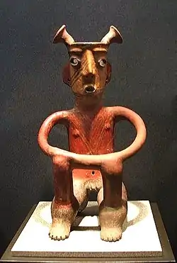 - Ceramic dogs are widely known from looted tombs in Colima. Dogs were generally believed in Mesoamerican cultures to represent soul guides of the dead[32] and several dog ceramics wear human masks.[33] Nonetheless, it should also be noted that dogs were often the major source of animal protein in ancient Mesoamerica.[34]