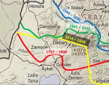 109 historical and 31 ethno-linguistic maps (1607-2014) compiled by the researchers in Ghent University in Belgium show that starting from the late 17th C., internal boundaries are clearly shown, with 37 maps (between 1683 and 1941) displaying a boundary that is located well south of the Tekeze River, or even south of the Simien mountains. Welkait is explicitly included within a larger Tigray confederation (periods 1707-1794; 1831-1886; and 1939-1941); it is briefly mapped as part of Amhara in 1891-1894 and part of Gondar from 1944-1990. At other periods it appears independent or part of a larger Mezaga (“dark earth”) lowland region.[2] During the era of the princes, areas west of the Tekeze river was governed by Semien based hereditary. Ras Gebre of Semien was the governor of Semien, Tsegede, Wolkait and Wogera, his long reign lasted 44 years and came to an end in 1815. His son Haile Maryam Gebre succeeded him and reigned between 1815-1826 and was succeeded by his son Wube.[9][10][11]