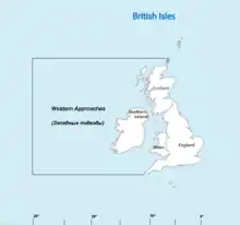 The Western Approaches is an approximately rectangular area of the Atlantic Ocean lying immediately to the west of Ireland and parts of Great Britain. Its north and south boundaries are defined by the corresponding extremities of Britain. The coast of the mainland forms the eastern side and the western boundary is the 30 degree meridian, which passes through Iceland. The area is particularly important to the United Kingdom, because many of its larger shipping ports lie within it.