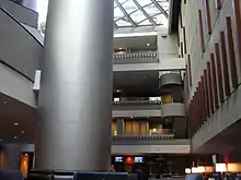 When the building first opened in 1976, the seven-story tall lobby atrium rose out of a half-acre, fountain-filled indoor lake[8] known as the "lagoon.” The lobby bar was surrounded by large, oval "cocktail islands" which appeared to float on the lake[9] and the entire area was decorated with tapestries, sculptures, cages with live birds and over 100 trees.[10] According to a contemporary postcard, architect Portman designed this area "as a modern interpretation of a Venetian Plaza".[11] In a newspaper advertisement, the hotel called the lobby "more like a park" and claimed it was "a total departure from any other you've ever seen."[12]
