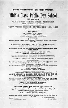 The charters and foundations of several historic charity schools[3] were by Act of Parliament in 1873 incorporated into the Grey Coat Hospital Foundation and United Westminster Schools (UWS) Foundation. UWS comprised the Westminster City School and Emanuel School, Wandsworth; the Grey Coat Hospital Foundation comprised the Grey Coat Hospital, Westminster and Queen Anne's School, Caversham. In 1910, the Worshipful Company of Clothworkers transferred the Sutton Valence School in Kent into UWS.[4] [5] Westminster City School is amalgamation of the former Brown Coat, Green Coat and Black Coat schools. Key dates in its history are:[5]