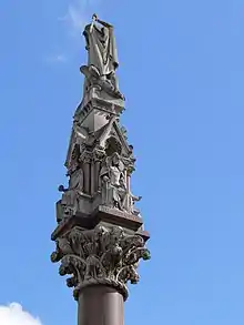 The memorial comprises a tall pink Peterhead granite pillar, carved with a ring of blank shields about half way up, topped by a Portland stone capital and statues. The statue atop the column was carved by J. R. Clayton and depict St George slaying the dragon, below which is a lantern tier with four Gothic niches, housing statues of St Edward the Confessor (facing east), Henry III (west), Elizabeth I (south) and Queen Victoria (north), all carved by J. Birnie Philip, above a highly decorated floral capital. The pillar stands on a stone base with four granite pilasters, each topped by a stone statue of a lion, resting on three octagonal steps, ringed by iron railings. The base stands about 4.3 m (14 ft) high, with the column and statues another 18.6 m (61 ft) on top.