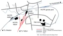 The 1892 Act of Parliament to allow completion of the line also authorised connections to be built to the GWR at both Portishead and Weston-Super-Mare.[21] The Portishead connection was brought into use on 2 November 1908[20] after which the connection at Clevedon was seldom used. The connection near Milton was never built, instead a 'Weston-Super-Mare Junction Light Railway' was proposed to take a line to Locking Road where it would connect with the Weston-super-Mare & District Tramway near their depot. It was hoped that coal traffic could be taken to the tramway company's depot and a nearby pottery, while tram cars from the sea front could reach the WC&PR. The Light Railway Commissioners refused approval for the connection to the depot and the lines were never built.[22]