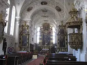 The former abbey church of the Assumption is now a parish church. It was built in the 12th century and altered in the 17th in the Baroque style by Michael Thumb.