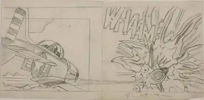 Whaam! adapts a panel by Irv Novick from the "Star Jockey" story from issue No. 89 of DC Comics' All-American Men of War (Feb. 1962).[23][24][25] The original forms part of a dream sequence in which fictional World War II P-51 Mustang pilot Johnny Flying Cloud, "the Navajo ace", foresees himself flying a jet fighter while shooting down other jet planes.[26][27] In Lichtenstein's painting, both the attacking and target planes are replaced by different types of aircraft. Paul Gravett suggests that Lichtenstein substituted the attacking plane with an aircraft from "Wingmate of Doom" illustrated by Jerry Grandenetti in the subsequent issue (#90, April 1962),[28] and that the target plane was borrowed from a Russ Heath[29] drawing in the third panel of page 3 of the "Aces Wild" story in the same issue No. 89.[28] The painting also omits the speech bubble from the source in which the pilot exclaims "The enemy has become a flaming star!"[30]