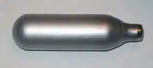 A whipped cream charger is a steel cylinder or cartridge filled with nitrous oxide (N2O) that is used as a whipping agent in a whipped cream dispenser. The narrow end of a charger has a foil covering that is broken to release the gas. This is usually done by a sharp pin inside the whipped cream dispenser. The nitrous oxide in chargers is also used as an oxidizer in hybrid model rocket engines.