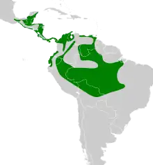 The nominate subspecies of the white-necked puffbird is found from southern Mexico through Central America into northern Colombia and northwestern Venezuela, and separately in southwestern Colombia and western Ecuador. Another separate population is found in central Colombia, eastern Ecuador and Peru, northern Bolivia, and eastern Venezuela south and east into much of Amazonian Brazil. N. h. paraensis is found only in the Amazon River valley of the Brazilian state of Pará east of the Tapajós River. The species inhabits a wide variety of landscapes. It mostly occurs in semi-open environments such as secondary forest, the edges of primary forest, open woodlands, savanna, and clearings. It also occurs in the interior of tropical evergreen, semi-evergreen, and terra firme forest; the landward side of mangrove forest; and plantations. It is found at all levels of the forest, from the ground to the canopy. In elevation it mostly ranges from sea level to 1,200 m (3,900 ft).[5]