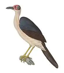This species was first described by Coenraad Jacob Temminck in 1825 from a specimen collected on the Guinean coast.[3] He published his description in the 2nd volume of Nouveau recueil de planches coloriées d'oiseaux and described it as Corvus gymnocephalus, placing it in the crow genus Corvus.[3] The species name is derived from the Ancient Greek words gymnos "naked", and kephalē "head".[4] However, only three years later the bird was removed from the genus Corvus by René Primevère Lesson and placed in its own genus, Picathartes, as it did not share characteristics common to members of Corvus such as a feathered head.[5] This generic name comes from a combination of the Latin genera pica for "magpie" and cathartes for "vulture".[6][7] Since its initial description, the picathartes have been placed in more than five different families, including those of crows (Corvidae), starlings (Sturnidae), Old World flycatchers (Muscicapidae), babblers (Timaliidae) and Old World warblers (Sylviidae).[8] Today the white-necked rockfowl and its close relative the grey-necked rockfowl are believed to comprise a unique family, Picathartidae.[3] It has also been suggested though not generally accepted that the two rockfowl represent the remnants of an ancient bird order.[9] Recent DNA analysis has shown that Picathartidae and its closest relatives, southern Africa's rockjumpers and southeast Asia's rail-babbler, form a clade. The analysis suggests that the rockfowl split from the common ancestor of their clade 44 million years ago.[10] It is believed that the ancestor of this clade originated in Australia and spread to Africa.[10] Though the white-necked rockfowl has no subspecies, it is believed to form a superspecies with the grey-necked rockfowl, with plumage and facial pattern being the primary differences between the two species.[3]