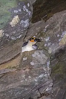 The White-necked rockfowl breeds primarily in caves and pairs nest either alone or as part of a small colony.[18] While its courtship behavior is unknown, the species is monogamous and therefore does not breed with rockfowl other than its mate despite earlier suggestions that it bred cooperatively.[18][21] The White-necked rockfowl has two breeding seasons throughout the year, though the timing of the breeding seasons is determined by the location of the birds and the timing of the wet season, with nesting occurring just before and after the wet season and averaging 127 days apart.[18] The rockfowl reuses its nest, and typically repairs it two to eight weeks prior to laying eggs.[23] Guinean birds breed from July to January, while those in Sierra Leone breed from November to February and from April to October.[18] In Liberia, breeding occurs from September to December and from March to July.[18] Ghana's rockfowl breed from March to June and September to November.[18] Breeding caves are traditionally deserted while the rockfowl are not breeding, so increased usage by the rockfowl is considered a first sign of breeding.[18] Nesting colonies average two to five nests, although one colony had forty nests.[20] In addition to breeding birds, sometimes non-breeding rockfowl are present. These birds occasionally attempt infanticide to gain access to prime nesting sites or mates.[22] Birds in these colonies often chase each other in circles, even through the treetops, a rare destination for this species.[18]
