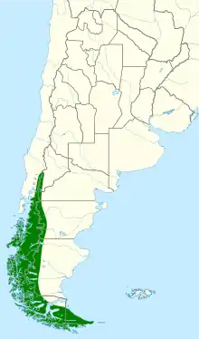 The white-throated caracara is the southernmost member of the "mountain caracara" superspecies. It is found from south-central Chile's Los Lagos Region and western Argentina's Mendoza Province south to Tierra del Fuego and Cape Horn. It inhabits open mountain slopes, southern beech (Nothofagus) forest, open woodland, and dense scrublands. In Chile it ranges in elevation from about 500 to 2,500 m (1,600 to 8,200 ft) and in Argentina from sea level to 3,000 m (9,800 ft).[5][9]