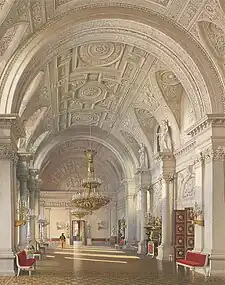 The space of the hall is divided into three unequal parts by the pylons projecting from the walls, on which the underpinning arches rest. The pylons are trimmed with paired pilasters of the Corinthian order. The wall plane between the pylons is in turn divided into three parts in Corinthian order by columns topped with a sculpture. The walls of the extreme compartments are dissected by smaller pilasters decorated with a stucco decoration; above them runs a wide band of bas-relief. At the Emperor's notice in the end wall, it was decided not to decorate the apertures with porticoes with columns and a triangular pediment, as Brullov had intended.[1]