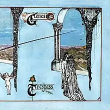 "White Mountain" and "Dusk" had been worked out by Phillips and Rutherford before deciding to record the album. The whole group worked on the music for "Stagnation", originally called "Movement", that Gabriel added lyrics to.[20] "Visions of Angels" was recorded for the previous album From Genesis to Revelation, but not used – the band did not think any takes of it were good enough – so it was re-recorded for Trespass.[15] It originated from 1968 a piano piece by Phillips at a time when his piano technique was limited, but could produce a "plodding" style similar to songs by the Beach Boys and the Beatles.[21] It has a more straightforward verse/chorus structure than some of the other songs.[22][23] "Stagnation" and "Dusk" showed Phillips and Rutherford's combined twelve-string sound, along with Banks taking a lead on piano, organ and Mellotron. This subsequently became a trademark of early Genesis.[24] Rutherford later recalled there were around ten acoustic guitars on part of "Stagnation", but they cancelled each other out in the final mix.[25] Gabriel described the track as a "journey song" with its lack of a more typical verse/chorus structure and the variety of mood changes it presents.[26] At one point during its development the song was around 13 minutes long before sections were removed or altered, but the introduction remained unchanged.[27]