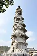 The White Pagoda in the park was at the Baita Hill, which is named after the pagoda, near the Qiantang River. Due to its geographical proximity to the site where the Grand Canal flows into the Qiantang River, the pagoda was used for ship navigation.[13]: 190 The pagoda looks like a wooden structure but was made of stacked stone, which has nine floors, with a total height of 14 metres.[13]: 190 [14]: 1-2 Structured as an octagon, each floor of the pagoda shrinks in area until the tip of the pagoda. The stone reliefs on eight sides of the octagon represents the nine mountains and eight seas in Buddhism.[14]: 1–2