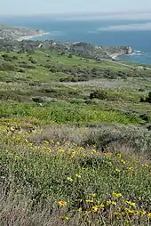The Palos Verdes Nature Preserve is the largest of the Conservancy's preserves consisting of approximately 1,400 acres (5.7 km2) of rolling hills, steep canyons and rock outcrops, with natural habitat and views of the Pacific Ocean and Santa Catalina Island. The City of Rancho Palos Verdes owns most of the land and the Palos Verdes Peninsula Land Conservancy manages the preserve.[4] The preserve is made up of 10 reserves: Abalone Cove Ecological Reserve, Agua Amarga Reserve, Alta Vicente Reserve, Portuguese Bend Reserve, Filiorum Reserve, Forrestal Reserve, Three Sisters Reserve, San Ramon Reserve, Vicente Bluffs Reserve, and Vista Del Norte Reserve.[5]