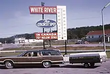 White River advertises itself as "The Coldest Spot in Canada" with recorded temperatures as low as −58 °C (−72 °F). However, this is a myth, as the coldest temperature in Canada was recorded in Snag, Yukon, at −62.8 °C (−81.0 °F) on 3 February 1947.[6] Even in Ontario, the coldest recorded temperature was in Iroquois Falls on 23 January 1935 [−58.3 °C (−72.9 °F)], which is also the lowest temperature ever recorded in Eastern Canada.[6] White River's reputation for being the "coldest spot" is probably based on the fact that for many years, its reported temperature was deemed "the coldest in the nation today" from the handful of stations reporting daily temperature extremes in newspapers and on radio, with most stations' data being available only on a monthly basis to Environment Canada at the time.