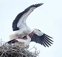 Several bird species often nest within the large nests of the white stork. Regular occupants are house sparrows, tree sparrows, and common starlings; less common residents include Eurasian kestrels, little owls, European rollers, white wagtails, black redstarts, Eurasian jackdaws, and Spanish sparrows.[84] Paired birds greet by engaging in up-down and head-shaking crouch displays, and clattering the beak while throwing back the head.[8] Pairs copulate frequently throughout the month before eggs are laid. High-frequency pair copulation is usually associated with sperm competition and high frequency of extra-pair copulation. It has been considered that extra-pair copulation rates were low but a 2016 DNA sample study suggests that extra-pair copulation occasionally occurs in white storks.[85][86][87] Despite the relatively high extra-pair paternity occurrence compared to other long-lived monogamous birds, white storks form strong pair bonds and high nest fidelity maintained across years.[17][88]