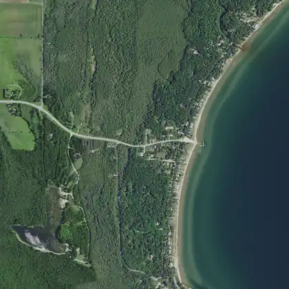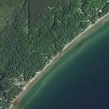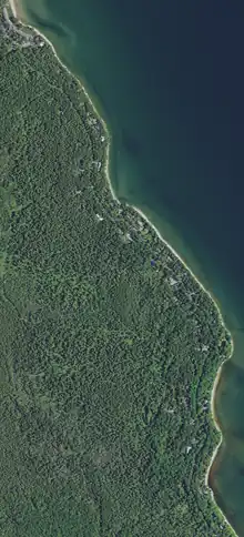 Glidden Drive runs parallel to the shore south of the row of Glidden Lodge Beach Resort condos (upper left corner). Extensive wooded areas both along the drive and set back further to the west are owned by the Nature Conservancy[12] and the Wisconsin Department Natural Resources[13] and are open to the public.[14]