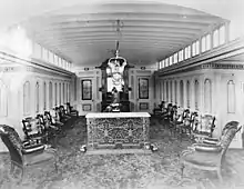 The floors of the boiler deck were covered with mosaic oil cloth. The hall in the forward part was said to have been painted in a “delicate shade of lilac.”[6] The forward hallway, which was known as the “social hall” included the purser's office on one side, and the freight clerk's office on the other. Ten staterooms, each containing two bachelor's berths, opened on to the forward hall.[6] Each stateroom was to have a stationary marble wash basin with hot and cold running water.[18] Large mirrors were placed at the ends of the cabins and chandeliers were hung at regular intervals trom the center line of the ceiling.[14]