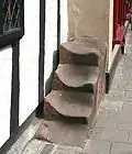 A grade-II-listed mounting block dating from the 17th or 18th century stands outside the Welsh Row face. It has four steps cut from a single stone block, which are much eroded.[22] The wear has been attributed to the adjacent butcher's shop (now incorporated into the Nakatcha Bar, formerly the Three Pigeons public house) belonging to Harry Bebbington, who is said to have sharpened his knives on the steps.[7][23]