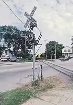 Wigwag is a nickname for a type of railroad grade crossing signal once common in North America, referring to its pendulum-like motion that signaled the approach of a train. The device is generally credited to Albert Hunt, a mechanical engineer at Southern California's Pacific Electric (PE) interurban streetcar railroad, who invented it in 1909 for safer railroad grade crossings. The term should not be confused with its usage in Britain, where "wigwag" generally refers to alternate flashing lights, such as those found at modern level crossings.[1]