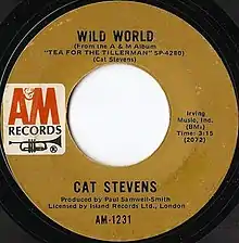 Released as a single in late 1970, it peaked at No. 11 on the Billboard Hot 100 chart.[2] "Wild World" has been credited as the song that gave Stevens' next album, Tea for the Tillerman, "enough kick" to get it played on FM radio; and Island Records' Chris Blackwell called it "the best album we've ever released".[3]