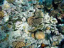 The loss of coral would have a subsequent effect on the total number of fish that exist within these ecosystems. In the Indo-Pacific coral reefs alone, there are in-between 4000 and 5000 different species of fish that have a relationship with the species of coral.[21] Specifically, the numerous different species of butterfly fish that feed on coral within these reefs would be affected if the coral was unable to live due to an increase in sea level.[21] Referring back to the food chain topic, this would then subsequently but directly affect species of snappers, eels, and sharks that use butterfly fish as a primary source of food.[22] If the snappers cannot find any butterfly fish to eat because the butterfly fish are dying due to the lack of coral, it means that the snapper population will decrease as well.