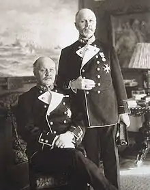 In addition to this, he was hired as an expert on various issues relating to the navy, including the 1902 Warships Building Committee. After being minister for naval affairs from 1906 to 1907 in Arvid Lindman's first cabinet, he was called as a member of the committee, which had the task of examining the issue of an adequate coastal defence ship type and whose work resulted in the then under the political feuds much talked-about F-type.[4] He was appointed rear admiral already at 46 years of age in 1904 and became Inspector of the Navy's Exercises at Sea,[4] a position he stayed in until 1916.[3] In 1905, Dyrssen became the Highest Commander (högste befälhavare) of the Coastal Fleet. In this position, he got the opportunity to develop an unshakable calm as well as other solid commander qualities, especially during preparedness along the Swedish west coast in connection with Union crisis in 1905. As inspector he demonstrated an extraordinarily confident glance and an infallible judgment.[4] On his responsible post, he remained even during the first stage of World War I.[4] In 1910, Dyrssen became a military member of the Supreme Court of Sweden and in the year after, he was promoted to vice admiral. He resigned from the position of Highest Commander of the Coastal Fleet in 1916, and was appointed station commander of Stockholm Naval Station. He left active service in 1923 and thereby received the highest of the three admiralty ranks.