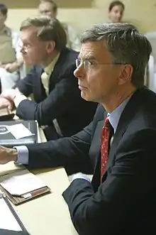 Taylor was nominated by President George W. Bush to be the United States ambassador to Ukraine while Taylor was serving as Senior Consultant to the Coordinator of Reconstruction and Stabilization at the Department of State.[17][18] He was confirmed by the U.S. Senate on May 26, 2006, and was sworn in on June 5, 2006. At the time Taylor assumed responsibilities at the embassy, it was the fifth-largest bilateral mission in Europe, with over 650 employees from nine U.S. government departments and agencies. A report by the Office of the Inspector General of the Department of State from 2007 notes that the new ambassador had "taken charge of the embassy in a remarkably effective and positive way," creating, together with Deputy Chief of Mission Sheila Gwaltney, a "formidable team at a mission that has a complex set of goals." It further noted that "Embassy Kyiv has a keen understanding of the complicated and rapidly evolving political and economic situation in Ukraine and has good working relations across the political spectrum. The embassy's commentary on such issues as the evolving state of Ukraine's relations with the European Union, North Atlantic Treaty Organization (NATO), and Russia is extensive, timely, and well appreciated by Washington end-users."[19] Taylor held the post until May 2009.[20]