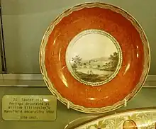 He stayed at Pinxton until 1799; The factory itself continued until Lady Day 1813, possibly only decorating "blanks" made elsewhere.[7] It was by then under the direction of a local landscape decorator, John Cutts who later obtained employment as a decorator at the Wedgwood factory.[8] Its products are scarce and well sought after commanding good prices. Billingsley's further moves took him to Mansfield, operating only a painting workshop, and about 1802 or 1803 to Torksey, Lincolnshire, where it has been claimed he made porcelain, as also at the neighbouring village of Brampton. It is thought he first came into contact with the potter Samuel Walker there, who later married Billingsley's daughter Sarah in 1812, when the group moved to Worcester porcelain. Another supposed pottery he started, between 1804 and 1808, was at Wirksworth in Derbyshire.[9] Before settling at Worcester, Billingsley approached a number of potteries in search of employment, including the Cambrian Pottery, Swansea, Glamorganshire in 1807.
