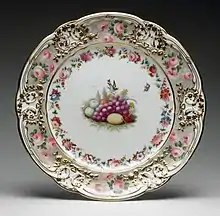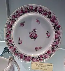 Billingsley was born in Derby in 1758. He was apprenticed at William Duesbury's Royal Crown Derby porcelain works for five years on 26 September 1774. He finally left them in 1796, by which time he was their outstanding painter of flowers, the mainstay of decoration.[2] Billingsley developed a distinctive style of flower painting, which involved using a loaded brush and then removing the colour using a dry brush.[3] He was particularly associated with borders of roses with the prime example of the Prentice Plate. This plate was used in the Derby factories to show trainees the standard that was expected. The name of The Prentice Plate is a shortening of Apprentice Plate.[4]