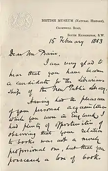 Carruthers' papers are held in multiple archive collections. His administrative records from his role as keeper of the Botanical Department are held at the Natural History Museum Library and Archives.[14] A series of Carruthers' notes and illustrations are held at the Cadbury Research Library, University of Birmingham.[15] Letters concerning Carruthers are held at the University of Edinburgh.[16]