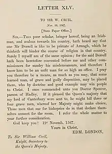In 1567, while obtaining an attorney (one Henry Style of Westminster) in the event he left England, Darell described himself as "Deane of Fernes in Irelande". This implies that Darell is the same "Mr. Dorrell" who was proposed to be Archbishop of Armagh.[2] The see went vacant in 1567, after the death of previous incumbent Adam Loftus. Among those subsequently proposed to the see was Darell. This nomination came to the attention of Edmund Grindal, Bishop of London, who apparently already regarded Darell as, in his biographer John Strype's description, "corrupt in religion; though otherwise outwardly complying."[4] Grindal assiduously opposed this nomination. On 19 November, he wrote to Secretary of State William Cecil to recommend against Darell; he spoke of one "poor scholar" in Ireland who had described to him how he dreaded Darell's election, believing his nomination would ultimately "hinder the course of religion in that country." Grindal moreover spoke of his own negative experiences with Darell: "the said Dorrell hath been heretofore convented before me and other commissioners for sundry his misdemeanours, and therefore I know him to be an unfit man for so high an office".[2][5] He recommended one "Dr. Spenser, Parson of Hadley", but also offered to send forth several candidates, from whom the Queen could choose.[5] Ultimately, Thomas Lancaster, previously Bishop of Kildare, was elected to the Archbishopric, most likely on the advice of Sir Henry Sidney, Elizabeth's Lord Deputy in Ireland. Cecil was apparently pleased with this nomination.[6]