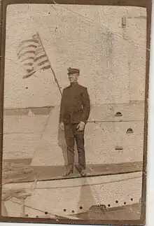 After his promotion to LTJG, he was ordered to the USS O-9 (SS-70) as the submarine's Executive Officer until her decommissioning on June 25, 1931. His next assignment was at the United States Naval Academy, where he was an English and History instructor.[5] While there, he received a Letter of Commendation from the Commandant of the academy for the many hours he volunteered to the academy's athletic department as a football and boxing coach. After his tour of duty at the academy, he was assigned to the USS Saratoga (CV-3) as the carrier's boiler division officer, ship's secretary to the Captain, and other duties. While serving on Saratoga, he was promoted to the rank of lieutenant on March 13, 1934.[6] He received a Letter of Commendation later that year from Commander Aircraft Battle Forces Atlantic Fleet for navigating the Saratoga through the Straits of Florida at high speeds in heavy weather and darkened ship conditions during Fleet exercises.[7] He remained on Saratoga for another 2 years until he was ordered to the Hydrographers Office in Baltimore, Maryland, on April 8, 1936, as the Commanding Officer of that office.[8] He served as Commanding Officer there until March 5, 1938, when he was sent to the USS Mississippi (BB-41),[9] where he served as the ships 1st Lieutenant and damage control officer.