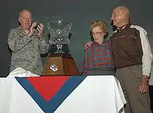 King's military decorations include the Air Force Distinguished Service Medal, Legion of Merit with oak leaf cluster, Bronze Star Medal, and Air Force Commendation Medal with oak leaf cluster.[1][2] He was honored as a space pioneer in 1989 and 1997, receiving honors from the Smithsonian Institution in 1989, and by the Air Force Space Command in 1997.[1] The Brigadier General William G. King trophy for the Space Command's best systems wing was named after him in 2008.[4] He died on 21 June 2009.[1][2]