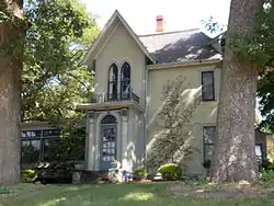 This two-story, frame house follows an irregular plan. It is eclectic in nature in that its builder borrowed from several architectural styles that are disassociated chronologically and based on a personal aesthetic. Though the practice was not uncommon in late 19th-century Davenport the other examples of eclecticism are transitional from one style to another.[2] The Smith House features a complex roofscape that begins with a large main roof shaped as a truncated asymmetrical gable in the back and a neo-mansard in the front. There are three gables on the west side of the house with one of them perpendicular to the other two. One of the more eclectic features of the structure is the Gothic Revival front gable located above a Colonial Revival entrance.[2] The entrance-way features engaged columns, a semi-circular fanlight, and a columned porch at the southwest corner. The house is located on a large corner lot with shaded grounds that contribute to its sense of prominence.