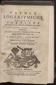 - Gardiner, William (1796). Tavole logaritmiche (in Italian). Florence: Pietro Allegrini & Gioacchino Pagani.