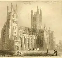 Gostling acted as a guide in Canterbury, but during the last two decades of his life was largely confined to his room.[2] He was visited in 1772 and again in 1773 by Sir John Hawkins, who was then researching his History of Music.[3] He died at his house in the Mint Yard, Canterbury, on 9 March 1777, and was buried in the cloisters on 15 March.[2] He possessed a significant collection of manuscripts of works by Henry Purcell; these were sold by Messrs. Langford. His library was sold by William Flackton of Canterbury in 1778.[4]