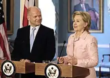 Prime Minister Cameron's first appointment was Hague as Foreign Secretary. He was also accorded the honorary title of First Secretary of State.[36] In his first overseas visit as British Foreign Secretary, Hague met US Secretary of State, Hillary Clinton, at Washington[37]